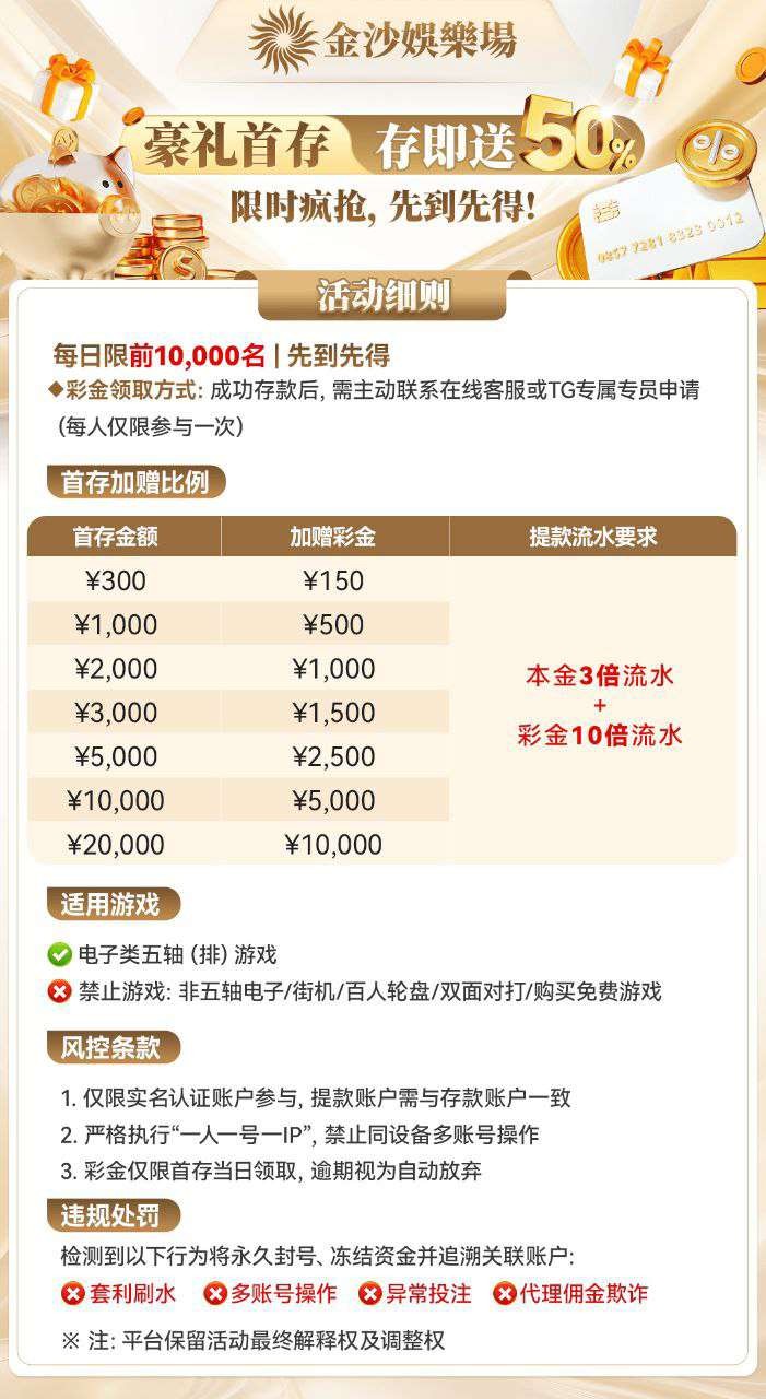 首存加赠50%,300+150,500+250,1000+500,3000+1500,5000+2500,10000+5000,要求本彩5倍盈利10倍流水起提,仅限投注五轴电子,禁止购买免费,具体规则看下图